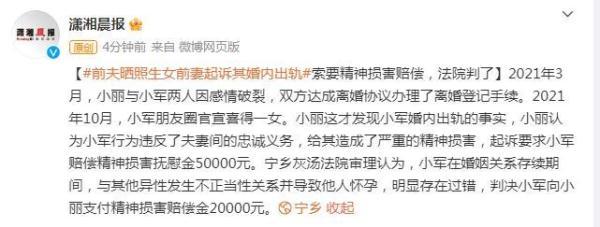 2021年3月,小丽与小军两人因感情破裂,双方达成离婚协议办理了离婚登记手续。2021年10月,小军朋友圈官宣喜得一女。小丽这才发现小军婚内出轨的事实,小丽认为小军行为违反了夫妻间的忠诚义务,给其造成了严重的精神损害,起诉要求小军赔偿精神损害抚慰金50000元。宁乡灰汤法院审理认为,小军在婚姻关系存续期间,与其他异性发生不正当性关系并导致他人怀孕,明显存在过错,判决小军向小丽支付精神损害赔偿金20000元。
