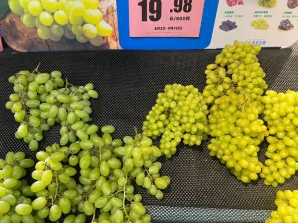 在水果销售区域,处在这种灯光照射范围内的阳光玫瑰葡萄,颜色格外透亮,而旁边恰好在灯光照射区域外的另外一串绿色葡萄,颜色就要暗淡不少。