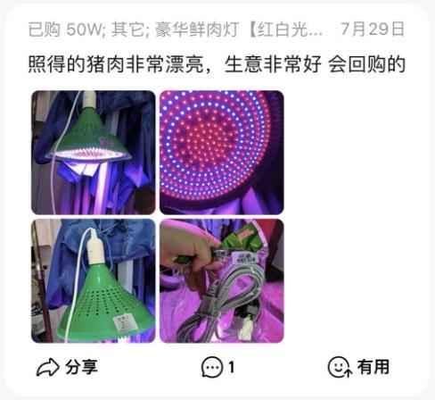 从评论区看,买家也大都是生鲜产品的经营者。一位买家这样表示:“照得猪肉非常漂亮,生意非常好,会回购”,还有买家表示:“物美价廉,准备再多买几个挂成一排。”