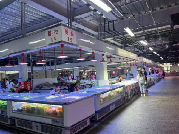 而在牛羊肉摊位对面,水产海鲜档口一字排开。不同于肉类区域的红色灯光,水产区域光线明显偏冷偏蓝,类似水族馆一般,与前者形成了鲜明对比。