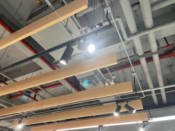 这些灯采用轨道射灯的造型,每隔几米就有一组,每盏灯都调好了照射角度,效果与新发地市场的吊灯大差不离。