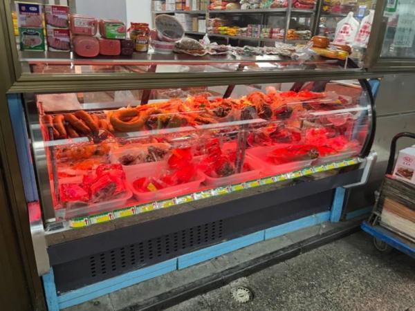 与天花板上的荧光灯相比,这些照射生鲜柜台的吊灯采用点阵式LED灯泡,颜色明显偏红。在灯光的照射下,每块肉看上去都是格外新鲜,肥的地方白花花、瘦的地方红彤彤。