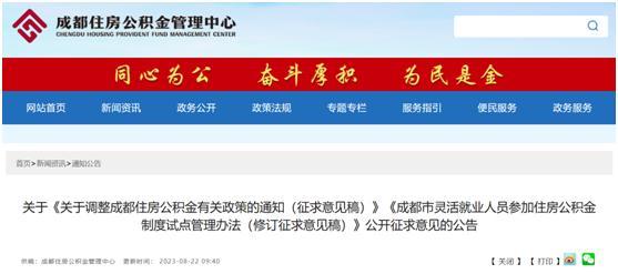 8月22日,成都住房公积金管理中心发布《关于调整成都住房公积金有关政策的通知(征求意见稿)》和《成都市灵活就业人员参加住房公积金制度试点管理办法(修订征求意见稿)》,对相关政策措施进行了优化。