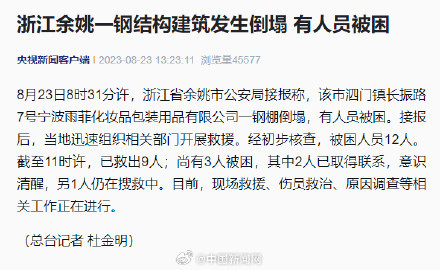8月23日8时31分许,浙江省余姚市公安局接报称,该市泗门镇长振路7号宁波雨菲化妆品包装用品有限公司一钢棚倒塌,有人员被困。接报后,当地迅速组织相关部门开展救援。经初步核查,被困人员12人。截至11时许,已救出9人;尚有3人被困,其中2人已取得联系,意识清醒,另1人仍在搜救中。目前,现场救援、伤员救治、原因调查等相关工作正在进行。(央视新闻客户端)