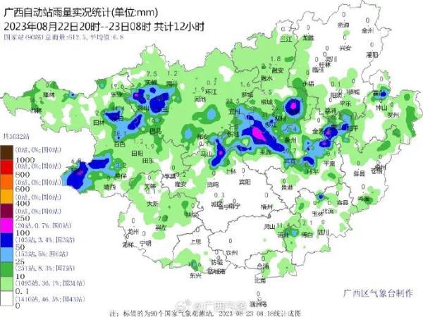 广西自动站雨量实况统计。