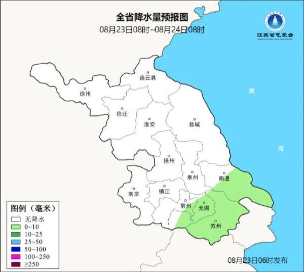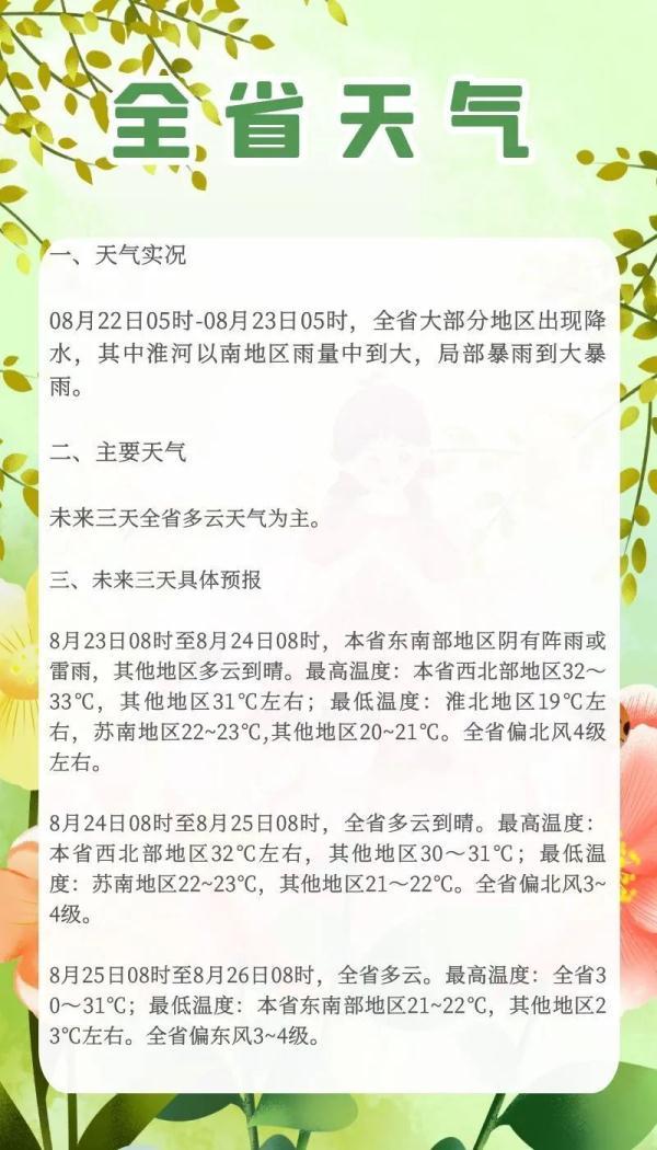 最低温度:淮北地区19℃左右,苏南地区22~23℃,其他地区20~21℃。