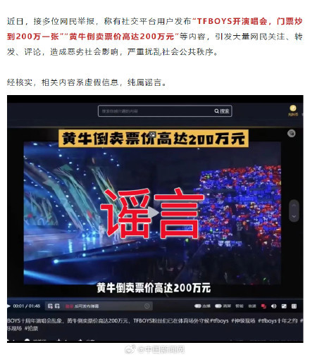 近日,接多位网民举报,称有社交平台用户发布“TFBOYS开演唱会,门票炒到200万一张”“黄牛倒卖票价高达200万元”等内容,引发大量网民关注、转发、评论,造成恶劣社会影响,严重扰乱社会公共秩序。经核实,相关内容系虚假信息,纯属谣言。谣言首发者系王某某被行拘。(公安部网安局)