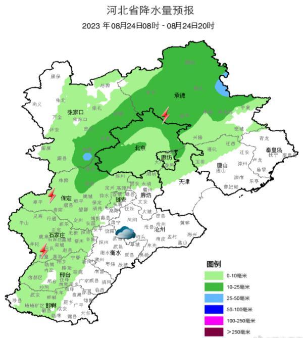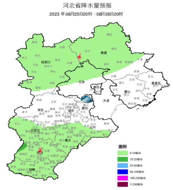 明天白天,张家口、承德、唐山北部、保定、廊坊、雄安新区、石家庄、邢台西部、邯郸西部阴有雷阵雨或阵雨,其中张家口南部、承德、保定北部有中到大雨,雷雨时局地伴有短时强降水、短时大风等强对流天气,其他地区多云。