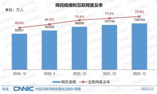 据2023年3月发布的第51次《中国互联网络发展状况统计报告》,截至到2022 年 12 月,我国网民规模为10.67亿,互联网普及率达75.6%。