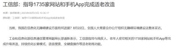 据澎湃新闻报道,工信部在8月22日接受媒体采访时表示,未来将指导1735家网站和手机APP完成适老改造。