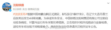 @沈阳铁路:根据中国地震台网正式测定,8月23日18时19分,在辽宁大连市普兰店区附近发生4.6级地震。为保证列车安全,中国铁路沈阳局集团有限公司立即启动应急响应,对管内运行列车采取扣停措施,正在组织对相关线路进行设备检查,途经列车将出现不同程度晚点。具体列车运行信息请关注相关站车公告。