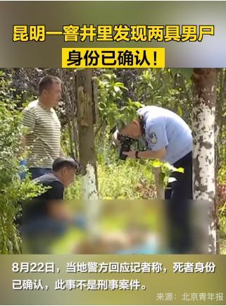 近日,云南昆明盘龙区一窨井里发现两具男尸,此事引发关注。8月22日,当地警方回应记者称,死者身份已确认,此事不是刑事案件。
