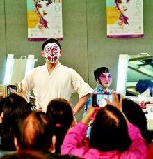 2022年11月,多元粵劇節目亮相香港「粵劇日」活動。圖為粵劇演員向觀眾示範粵劇化妝。香港特區政府新聞處圖片