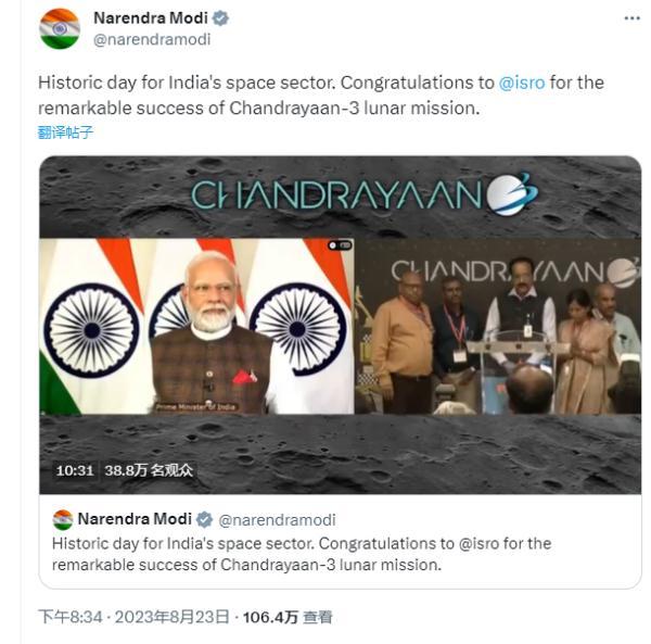 报道称,身在南非的莫迪在连线中表示:“印度现在登上了月球”。他还在社交媒体X上发文称,“这是印度航天事业中历史性的一天。祝贺‘月船3号’登月任务取得非凡成功”。