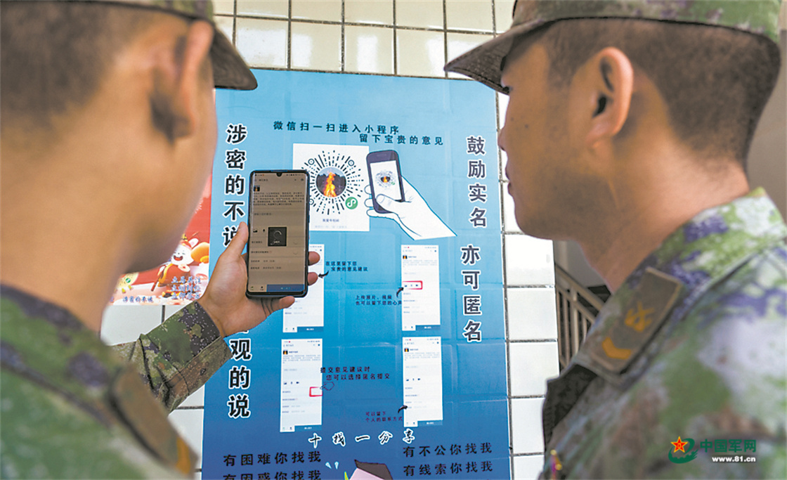 不久后,营里为收集意见建议设立开通了“意见码”。官兵只要扫一扫“意见码”,就可以匿名发表意见建议。