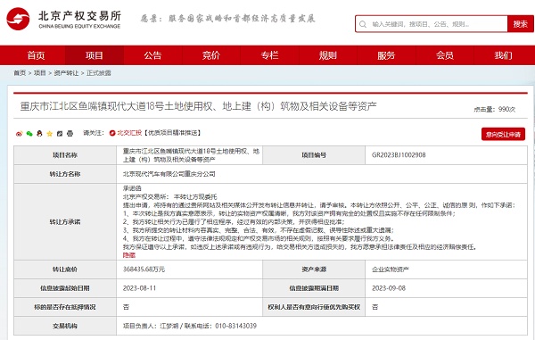 中国经济网8月24日讯(记者 陈梦宇)近日,北京产权交易所公布“重庆市江北区鱼嘴镇现代大道18号土地使用权、地上建(构)筑物及相关设备等资产”的资产转让公告,转让方为北京现代汽车有限公司重庆分公司,转让底价为36.84亿元。