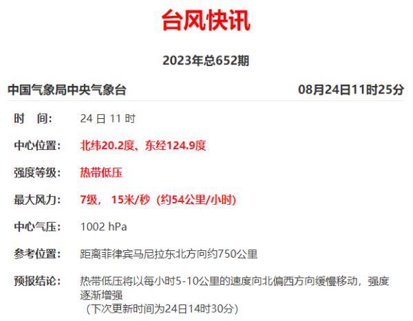 今天上午8点钟菲律宾以东洋面有热带低压生成。11时其中心位于马尼拉东北方向约750公里的西北太平洋洋面上,中心最大风力7级(15米/秒),中心气压1002百帕。