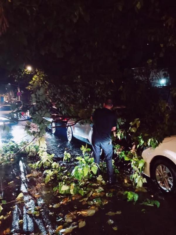 8月24日凌晨,广州市黄埔区蟹山西路一棵大榕树受暴雨大风影响倒伏,骑压在两辆私家车上,导致交通中断。记者从鱼珠街道了解到,街道及时组织抢险队进行疏通,现场无人员受伤。