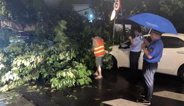 由于无法联系到车主,抢修队冒雨将车身范围以外的树枝进行了切割,经过一个小时的奋战,将枝干搬离现场,确保道路交通畅通。