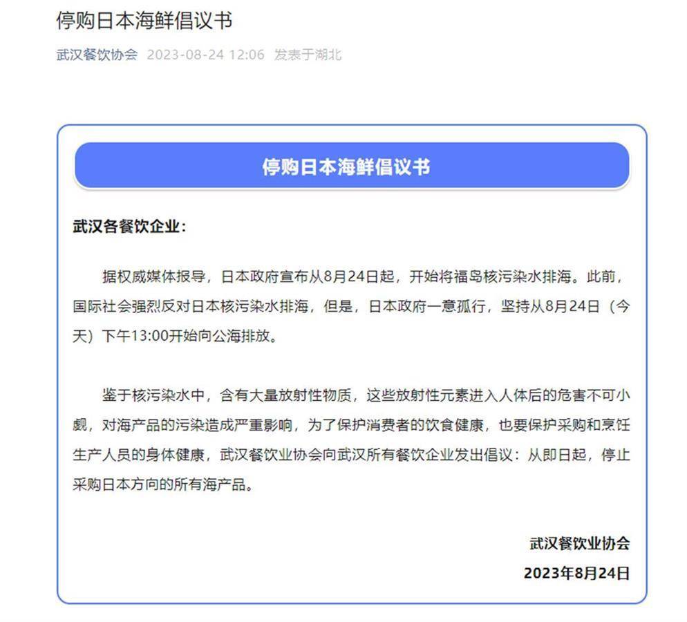 湖北日报讯(记者李朝霞、通讯员王灵儿)8月24日,武汉餐饮业协会向武汉所有餐饮企业发出倡议:从即日起,停止采购日本方向的所有海产品。