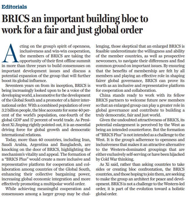 原文标题:BRICS an important building bloc to work for a fair and just global order