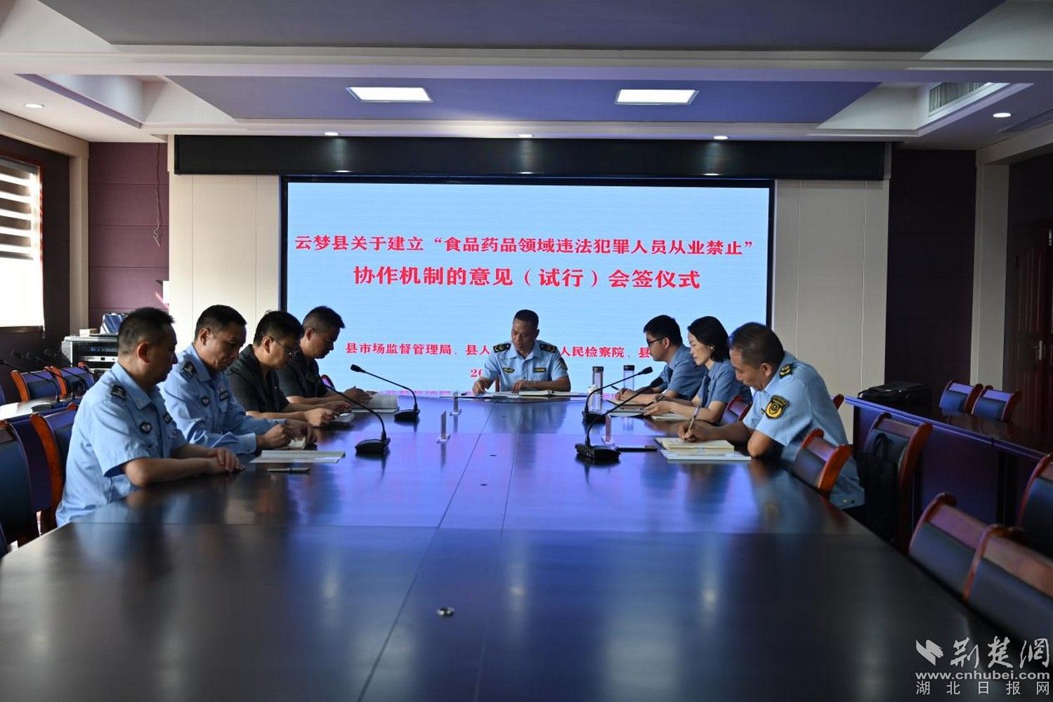 荆楚网(湖北日报网)讯(通讯员 李莹莹 陈爱荣)为贯彻落实习近平总书记关于食品药品安全“四个最严”和法律对涉罪食品药品从业人员限制或禁止重回食药行业的规定,8月24日,云梦县人民检察院与县市场监督管理局、县法院、县公安局联合会签了《关于建立“食品药品领域违法犯罪人员从业禁止”协作配合的意见》(以下简称《意见》),有效推进食品药品领域“从业禁止”,规范食品药品经营,保障群众健康安全。