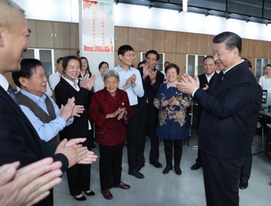 2018年4月24日至28日,中共中央总书记、国家主席、中央军委主席习近平在湖北考察。这是26日上午,习近平在武汉市青山区工人村街青和居社区考察棚户区项目建设和居民生活情况。新华社记者 谢环驰摄