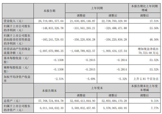 深桑达A今日发布2023年半年度报告显示,2023年上半年,深桑达A实现营业收入267.20亿元,同比增长17.51%;归属于上市公司股东的净利润-1.49亿元,同比增长53.56%;归属于上市公司股东的扣除非经常性损益的净利润-1.83亿元,同比增长48.56%;经营活动产生的现金流量净额-26.98亿元。