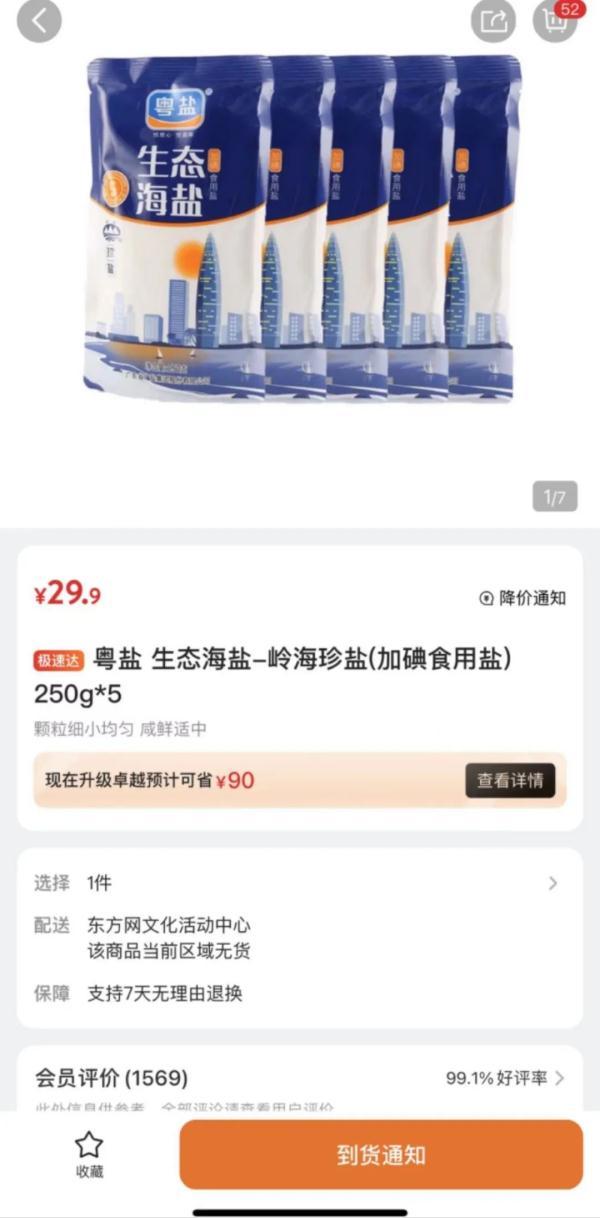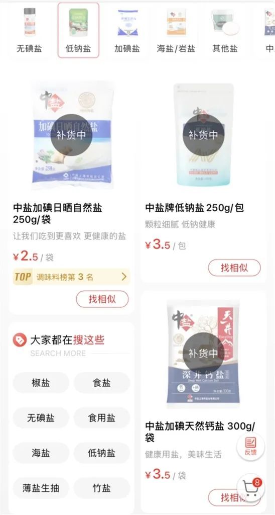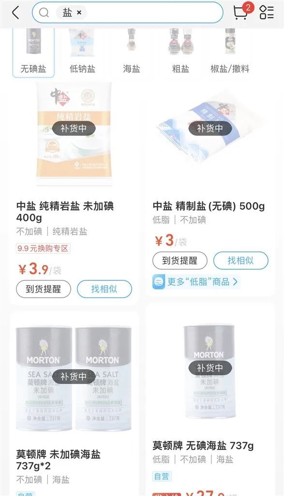 △图说:记者今天从盒马、大润发、山姆等超市在线购物平台发现,一些品牌食盐已售罄,显示“补货”中。”