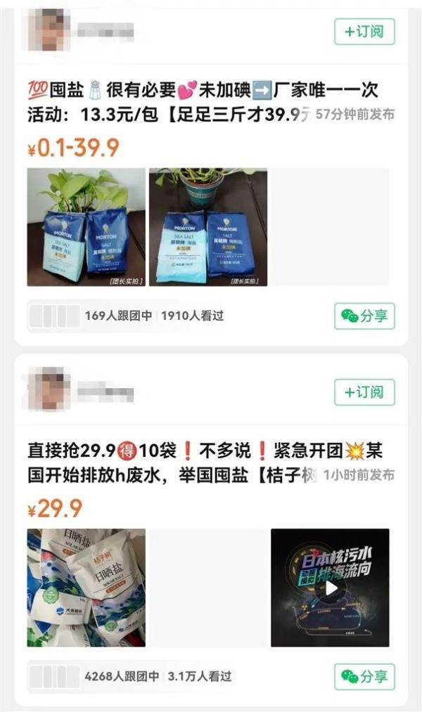 图说:某团购小程序中以“囤盐”“紧急开团”等词汇介绍购买食盐的信息。