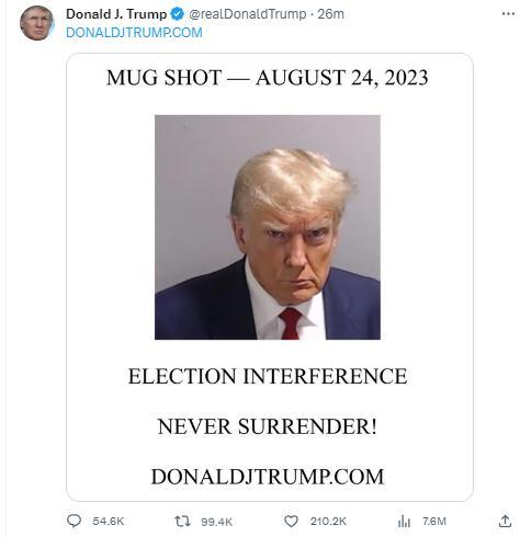 此外,据英国天空新闻网报道,在获得保释后,特朗普自己也在多个社交媒体上发布了这张照片,并指责“干预选举”,称自己“永不投降”。值得注意的是,特朗普当地时间24日也在社交媒体X(原推特)上发布了这一信息,天空新闻网称这意味着他自2021年1月8日以来重返该平台。