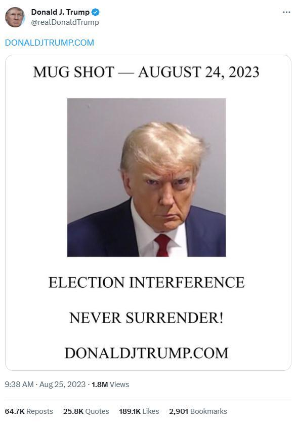 CNN称,这篇帖子中附上了特朗普在监狱中拍摄的嫌犯照片,在这张照片的下方,写着“干预选举”与“永不投降!”。