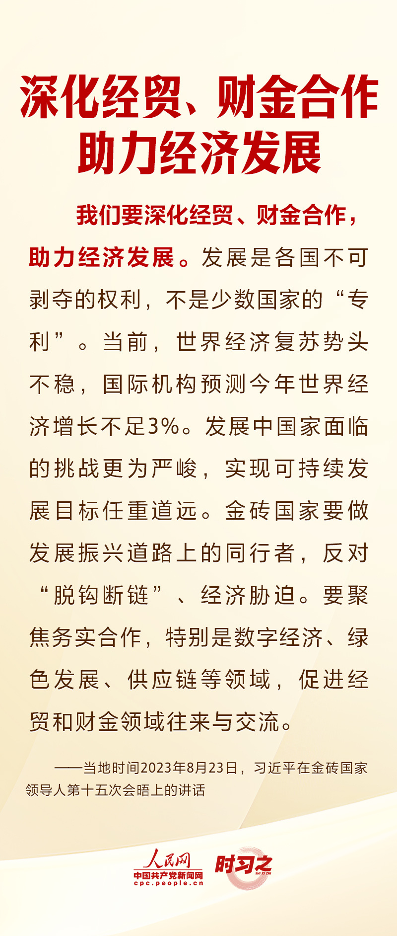 当地时间8月23日上午,金砖国家领导人第十五次会晤在约翰内斯堡杉藤会议中心举行。国家主席习近平发表题为《团结协作谋发展 勇于担当促和平》的重要讲话。以金砖责任应对共同挑战,以金砖担当开创美好未来,习近平提出四点倡议。
