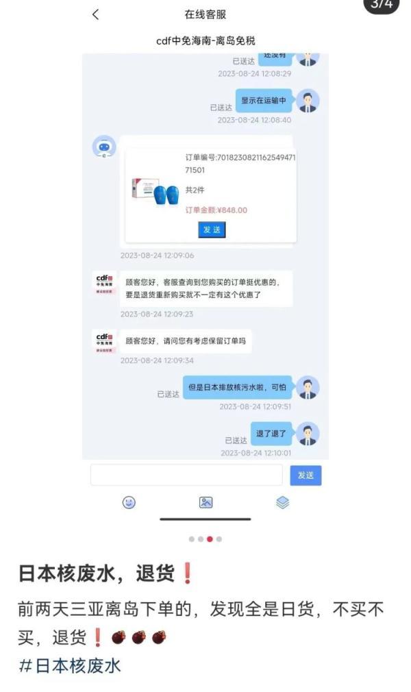 虽然日妆品牌纷纷“自证清白”,但记者注意到,在社交平台上,已有消费者将购买的日本化妆品退货。一位消费者就表示,前两日在三亚离岛免税店下单了化妆品,发现全是日货,果断退货。
