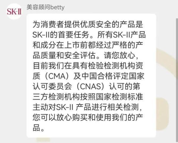 如,SK-II品牌客服表示,所有SK-II产品和成分在上市前都经过严格的产品质量和安全评估。“目前我们在具有检验检测机构资质(CMA)及中国合格评定国家认可委员会(CNAS)认可的第三方检测机构,按照国家检测标准主动对SK-II产品进行了相关检测,可以放心购买和使用我们的产品。”