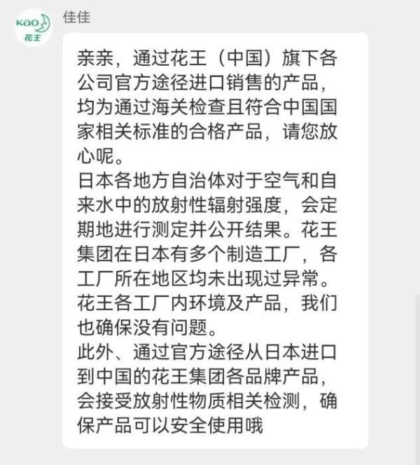 花王客服还强调,“通过官方途径从日本进口到中国的花王集团各品牌产品,会接受放射性物质相关检测,确保产品可以安全使用。”