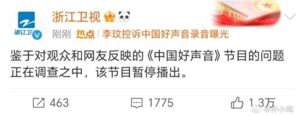 浙江卫视官微发布消息称,鉴于对观众和网友反映的《中国好声音》节目的问题正在调查之中,该节目暂停播出。