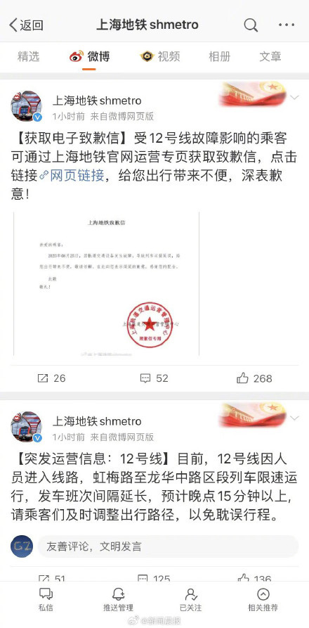 当天上午8点23分,上海地铁官方微博发消息称,12号线因人员进入线路,虹梅路至龙华中路区段列车限速运行,发车班次间隔延长,预计晚点15分钟以上。几分钟后,上海地铁又发布电子致歉信称,受12号线故障影响的乘客可通过上海地铁官网运营专页获取致歉信。