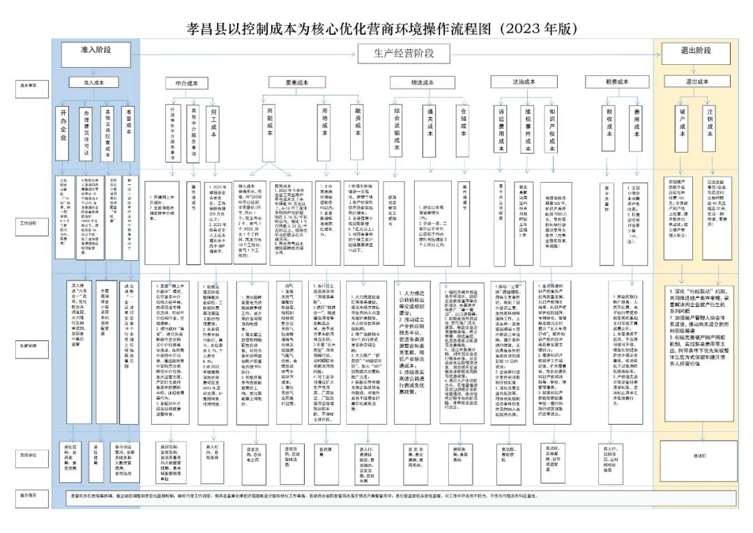 《流程图》显示,在准入阶段,开办企业环节对标全国最优,涉企小型项目基础设施配套实行“零收费”;小型低风险工业项目办理建筑许可环节从10个精简为8个以内,全面取消社会投资单体建筑面积20000平方米以下、建筑高度24米以下的一般工业类建设项目基础设施配套费;“一业一证”改革行业从19个扩大至30个等。