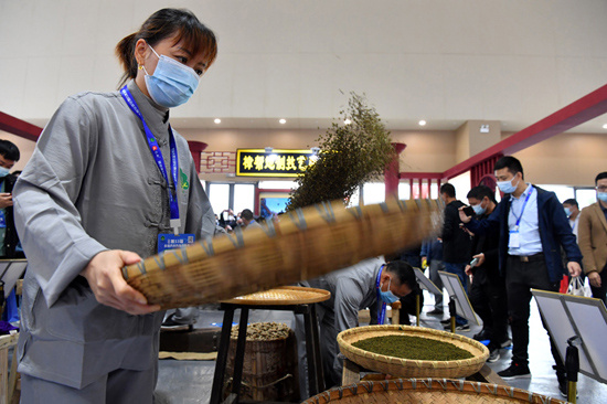 在樟树岐黄小镇里,药工正在进行樟帮中药炮制技艺展演。 人民网记者 时雨摄