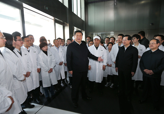 2016年2月3日,习近平在江中集团江中药谷制造基地考察时同企业科技人员在一起。新华社记者 兰红光摄