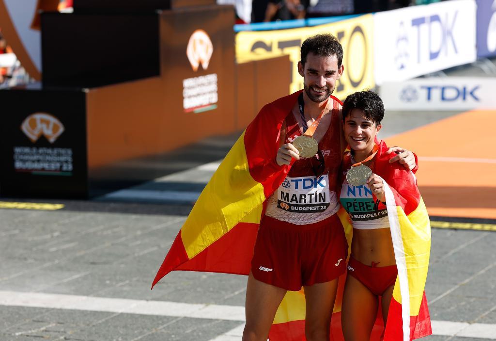 8月24日,西班牙选手阿尔瓦罗·马丁(左)和佩雷斯包揽男、女冠军后合影。新华社记者王丽莉摄