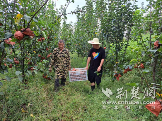“大家摘梨的时候尽量轻摘慢放,保护好果皮和果树枝条。”带队的采摘工人一边熟练地摘梨,一边叮嘱其他工友。这些采摘工人都是村里的村民,家里农活忙完,便来梨园打零工,一天能有120元左右的收入。