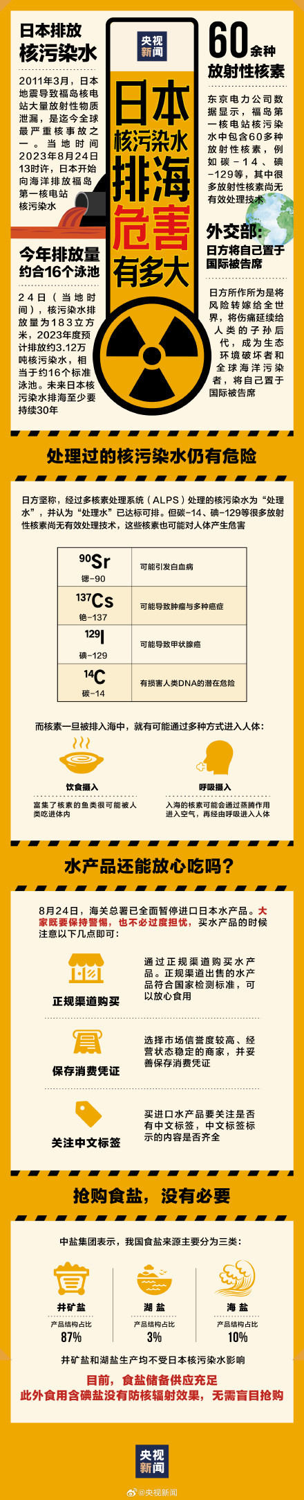 数据显示,福岛核污染水中包含60余种放射性核素,其中部分核素尚无有效处理技术。这些放射性核素可能通过饮食、呼吸进入人体,存在引发白血病、肿瘤等的风险,所谓处理过的核污染水也仍有危险。买水产品时需注意什么?转存了解。