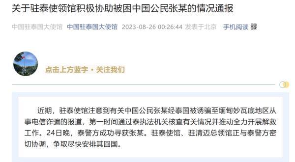8月26日,中国驻泰国大使馆发布通报:近期,驻泰使馆注意到有关中国公民张某经泰国被诱骗至缅甸妙瓦底地区从事电信诈骗的报道,第一时间通过泰执法机关核查有关情况并推动全力开展解救工作。24日晚,泰警方成功寻获张某。驻泰使馆、驻清迈总领馆正与泰警方密切协调,争取尽快安排其回国。