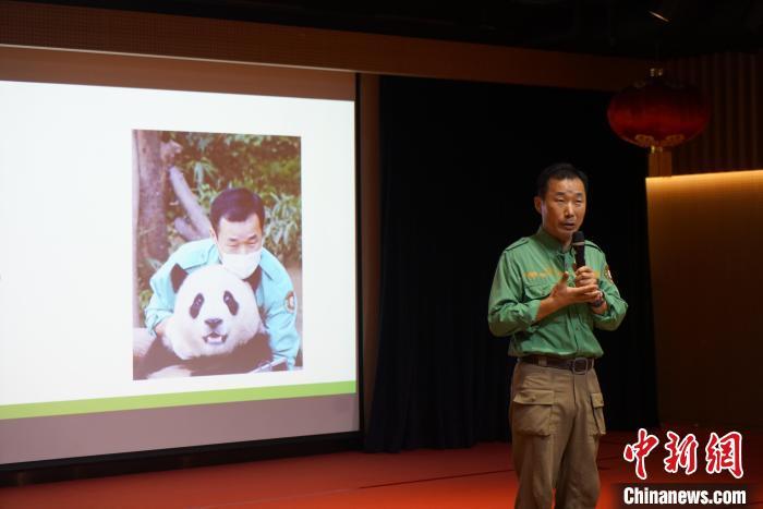 图为大熊猫“福宝”饲养员姜哲远进行讲座。 中新社记者 刘旭 摄