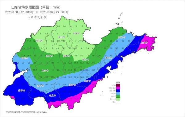 山东省气象台于8月26日09时30分发布暴雨蓝色和海上大风黄色、内陆大风蓝色预警:受气旋影响,26日-29日白天,山东自西向东将有一次明显降雨天气过程,全省累积平均降水量30~50毫米。其中,菏泽、济宁、枣庄、临沂、日照、潍坊南部、青岛南部、烟台南部和威海40~70毫米局部100~150毫米,聊城、德州、济南、泰安、淄博、潍坊北部和烟台北部10~30毫米局部50~80毫米,滨州和东营5~10毫米局部20~30毫米。强降雨时段集中在27日白天—28日白天,最大小时降水量20~40毫米,局部伴有雷电和7~9级雷雨阵风。