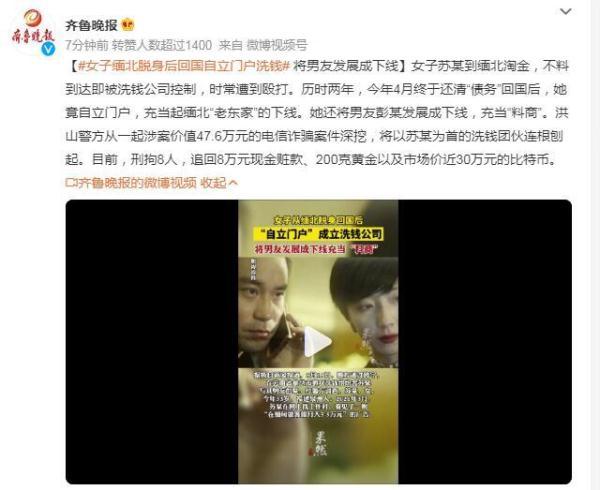 女子苏某到缅北淘金,不料到达即被洗钱公司控制,时常遭到殴打。历时两年,今年4月终于还清“债务”回国后,她竟自立门户,充当起缅北“老东家”的下线。她还将男友彭某发展成下线,充当“料商”。洪山警方从一起涉案价值47.6万元的电信诈骗案件深挖,将以苏某为首的洗钱团伙连根刨起。目前,刑拘8人,追回8万元现金赃款、200克黄金以及市场价近30万元的比特币。