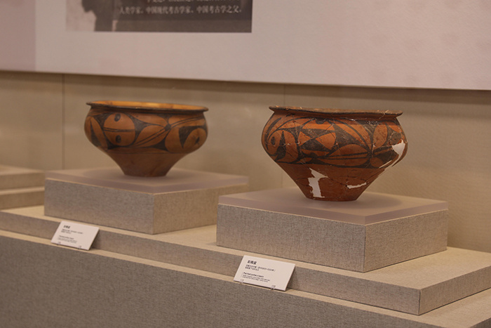 图为运城博物馆内展出的运城市垣曲县下马村出土的仰韶文化中期的彩陶盆。人民网记者 王帆 摄