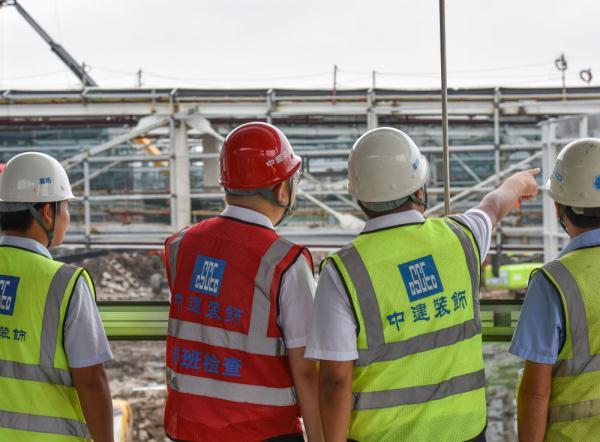 中建幕墙白云机场项目管理人员察看施工现场。新华社记者刘大伟摄